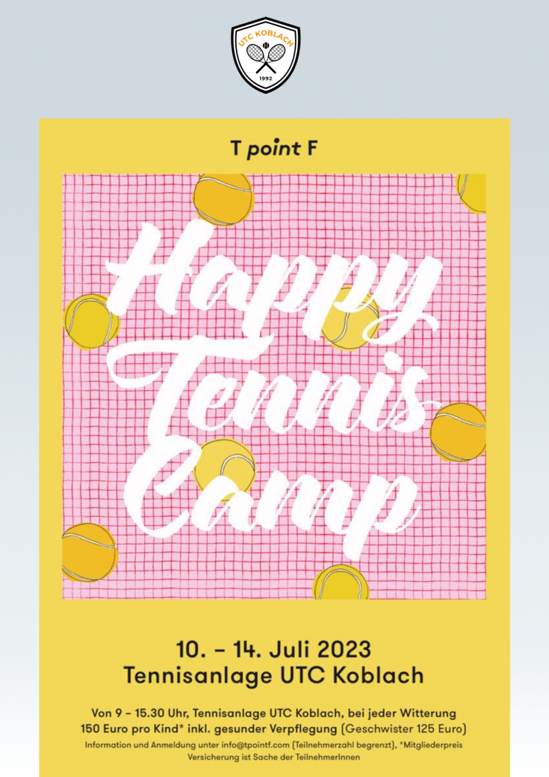 das Happy Tennis Camp in Koblach findet vom 10.07. - 14.07.2023 wieder auf der Anlage des UTC Koblach statt. Das Camp beginnt am Montag bis Donnerstag um 09.00 Uhr und endet um 15.30 Uhr und am Freitag geht es von 09.00 Uhr bis 12.00 Uhr.